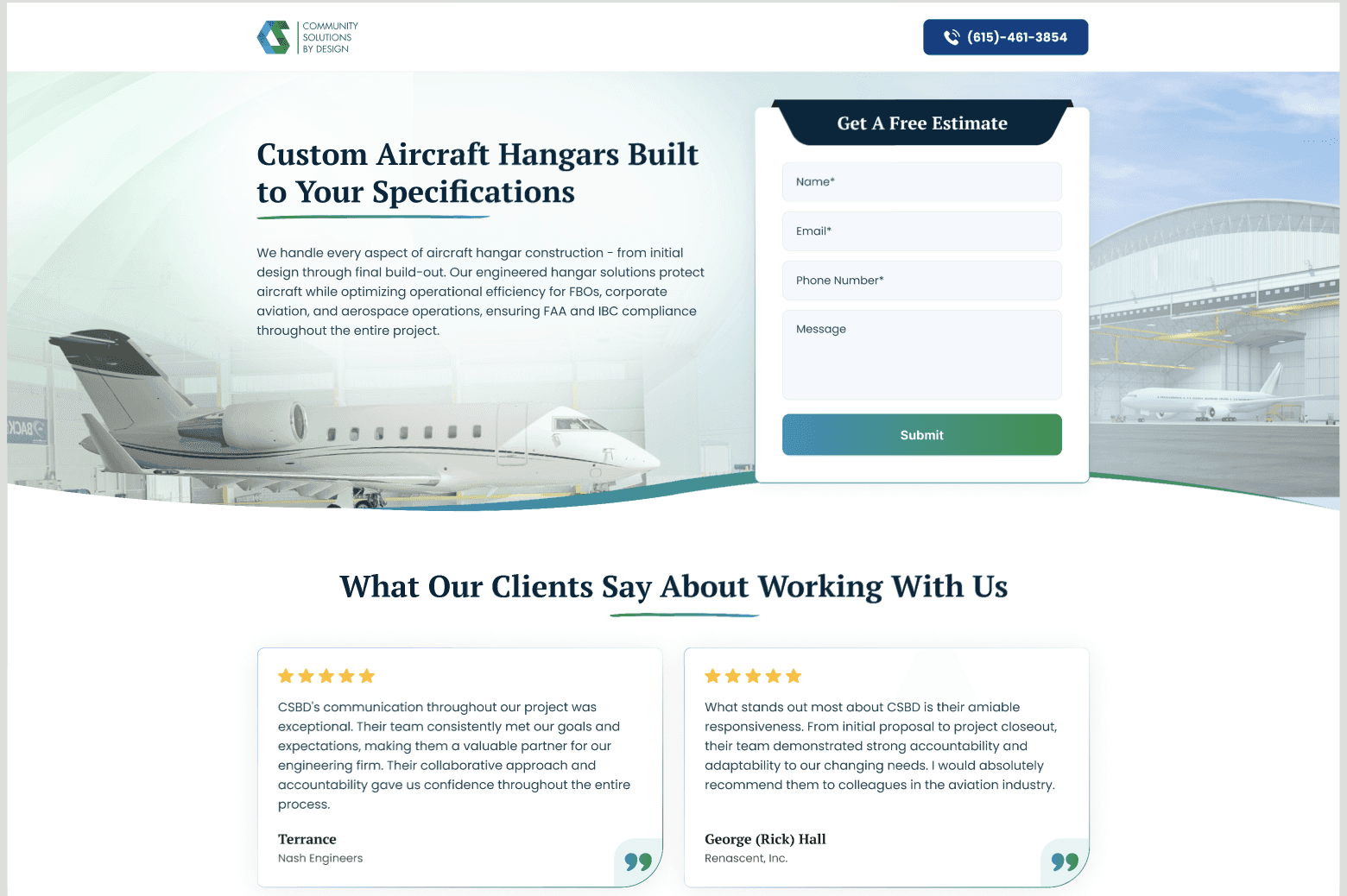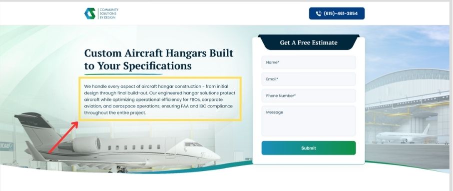 Solution: Your headline should not only communicate what the service is, but should explain your unique value proposition. Skip generic statements like "Aviation Architecture Services" and get specific about what makes you the obvious choice like "Custom Aircraft Hangars Built to Your Specifications". This gives visitors a concrete reason to choose you over competitors who make vague quality claims.