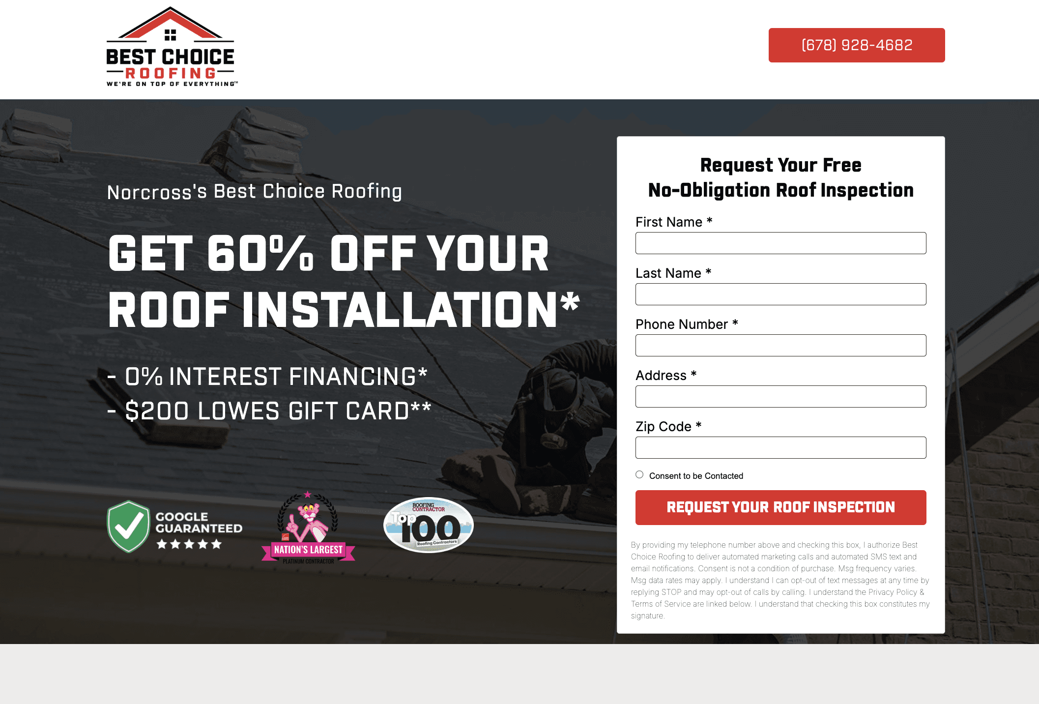 Best Choice Roofing's landing page demonstrates how the 8 fixes work together to create high conversions. There's zero navigation to distract visitors - they can either call or fill out the form. The phone number jumps out in a bright red button at the top right, impossible to miss.
