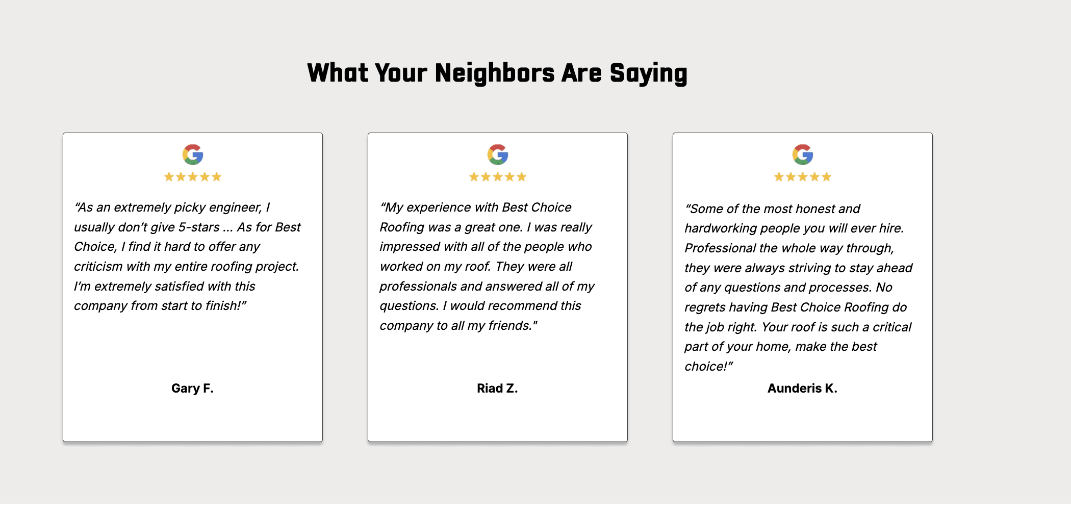 Solution: Feature real customer testimonials or trust badges prominently on your landing page. For testimonials, include full names and project details. Skip generic praise - showcase specific wins. For trust badges, display your Better Business Bureau rating, license numbers, insurance verification, and Google Reviews rating if strong. The goal is overwhelming evidence that you're the safe, reliable choice for their project.
